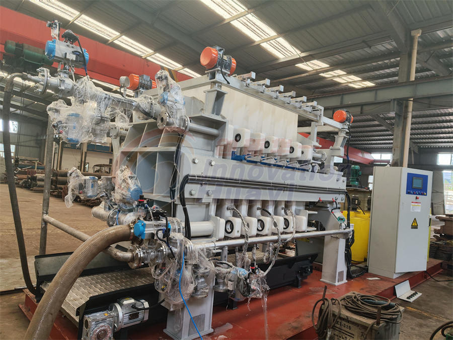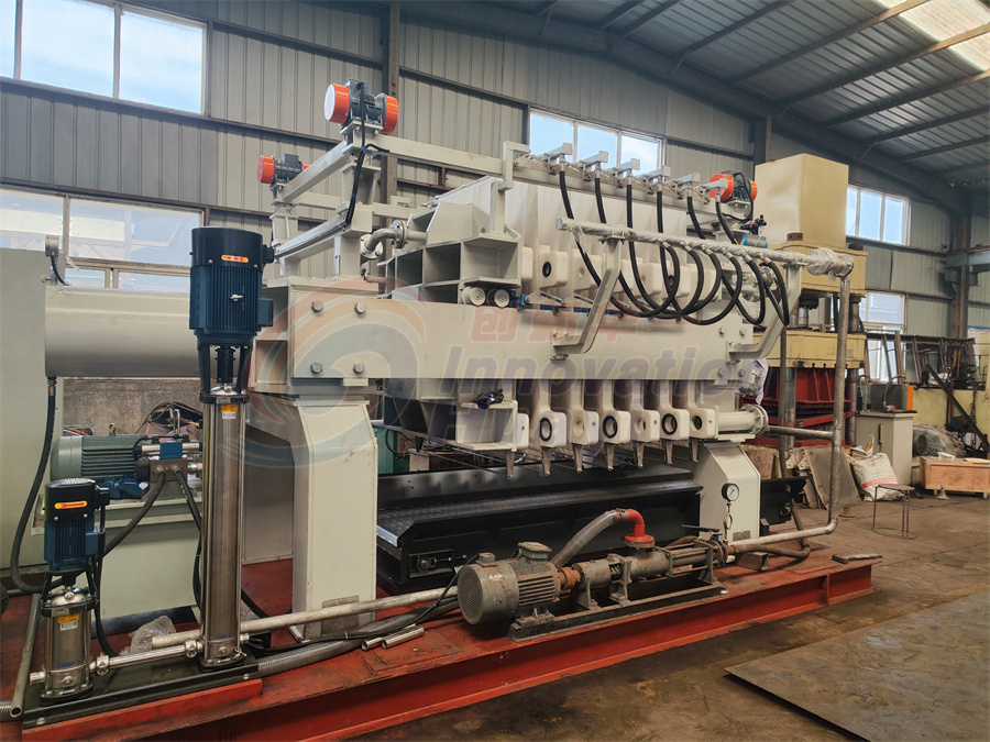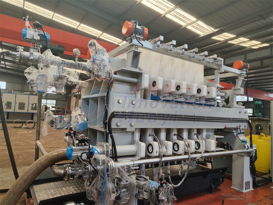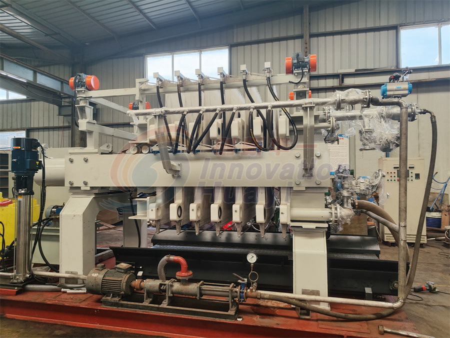 該機(jī)型是我公司研發(fā)生產(chǎn)的全新一代污泥深度脫水機(jī)。設(shè)備濾板可一次性全部拉開,并可以實(shí)現(xiàn)濾布整體振打,實(shí)現(xiàn)快速卸料,卸料完畢后設(shè)備所有濾布同時(shí)進(jìn)行沖洗;擠壓隔膜采用橡膠膜片,有更好的伸縮性,不需要腔室內(nèi)的污泥完全硬化,就可以進(jìn)行隔膜壓榨,提高了運(yùn)行效率,同時(shí)由于腔室內(nèi)的污泥沒有完全硬化,所以壓榨完后的濾餅會更薄更均勻,不存在濾餅中間含水率高的情況,含水率大大降低。